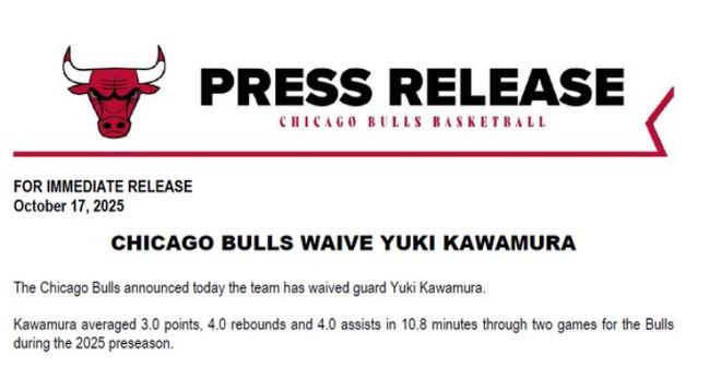 北京时间10月18日,公牛队官方宣布,球队已经裁掉了日本后卫河村勇辉。河村勇辉目前仍受右小腿疼痛困扰,未出战公牛队季前赛最后三场比赛。如今被裁后,他需另寻其他加盟机会。2025年季前赛期间,河村勇辉代表公牛队出战2场比赛,场均登场10.8分钟,能得到3.0分、4.0个篮板和4.0次助攻。